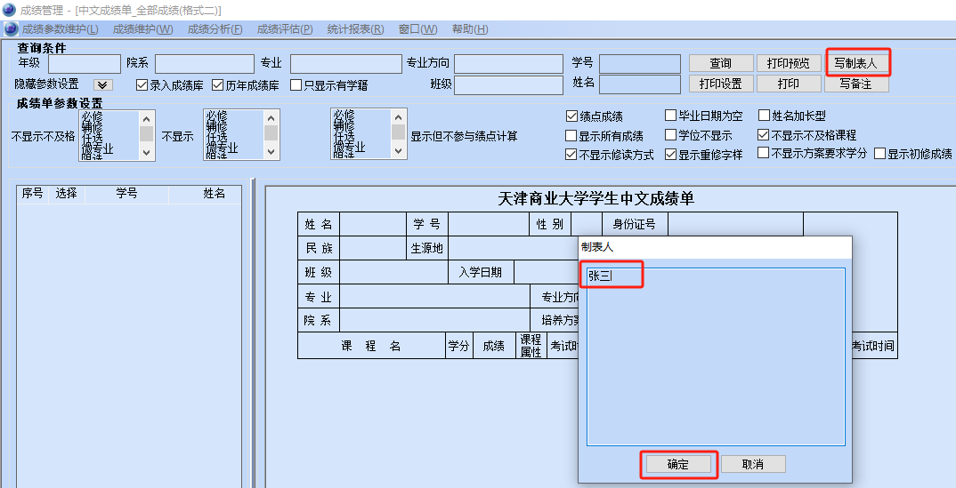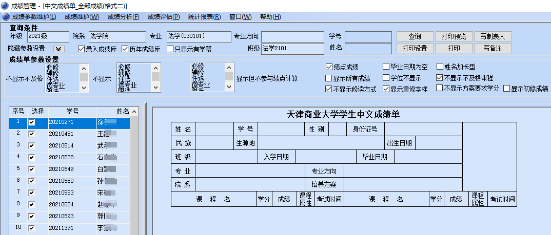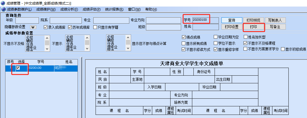 输入学号,设定参数,点击“查询”,勾选该生,点“打印”。