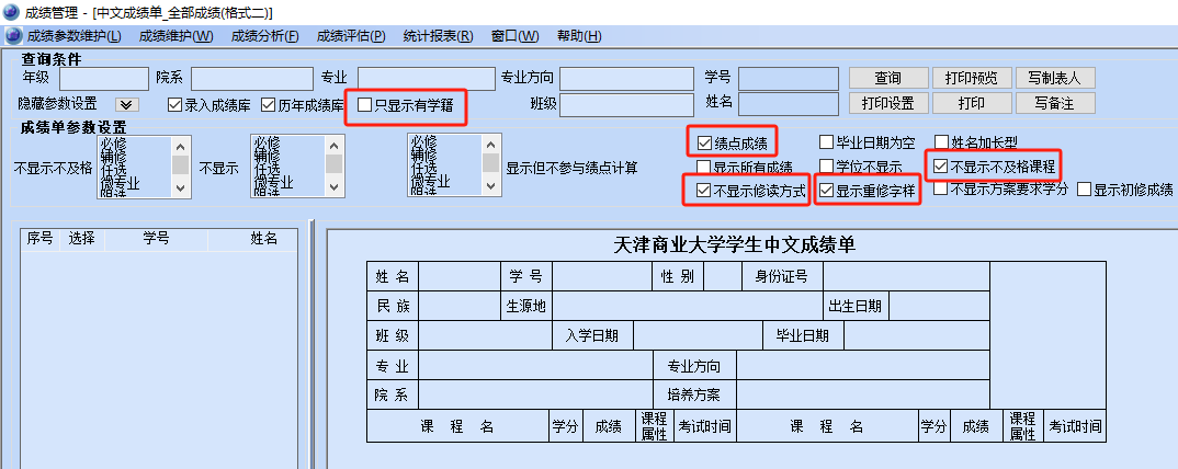 选择要查询的字段后,勾选“不显示不及格课程”、“绩点成绩”、“不显示修读方式”和“显示重修字样”,不勾选“只显示有学籍”。