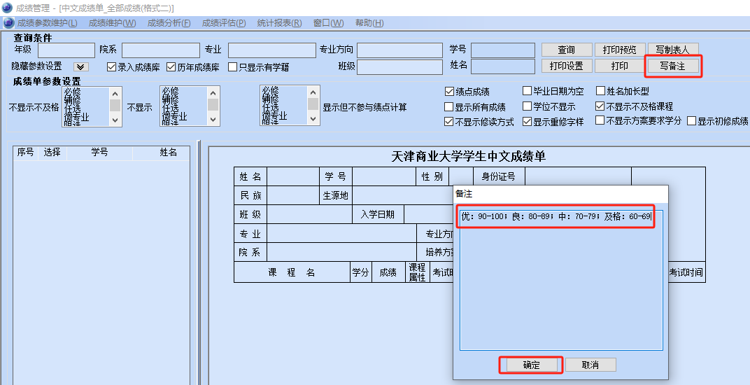 点击“写备注”按钮,在弹出的对话框中输入“优:90-100;良:80-89;中:70-79;及格:60-69”,点“确定”。